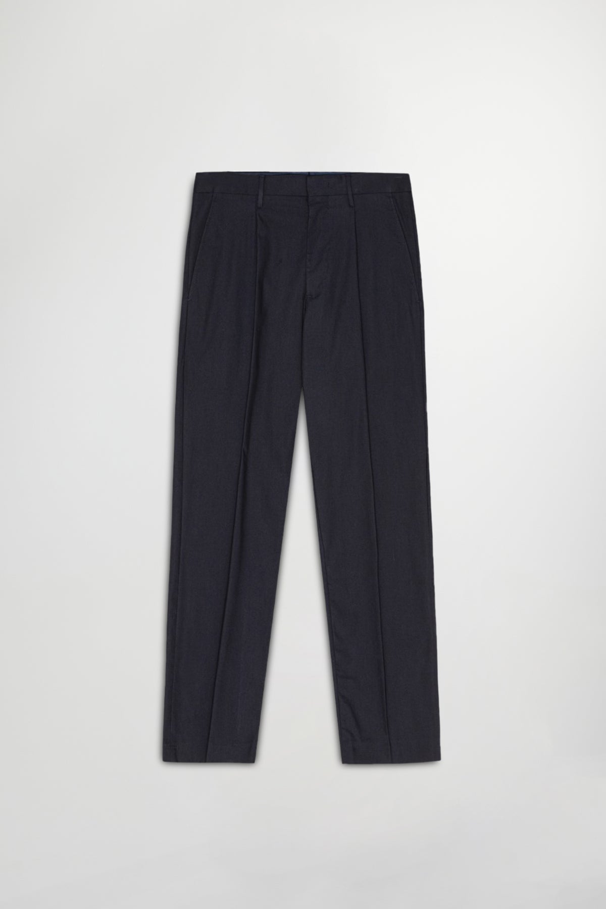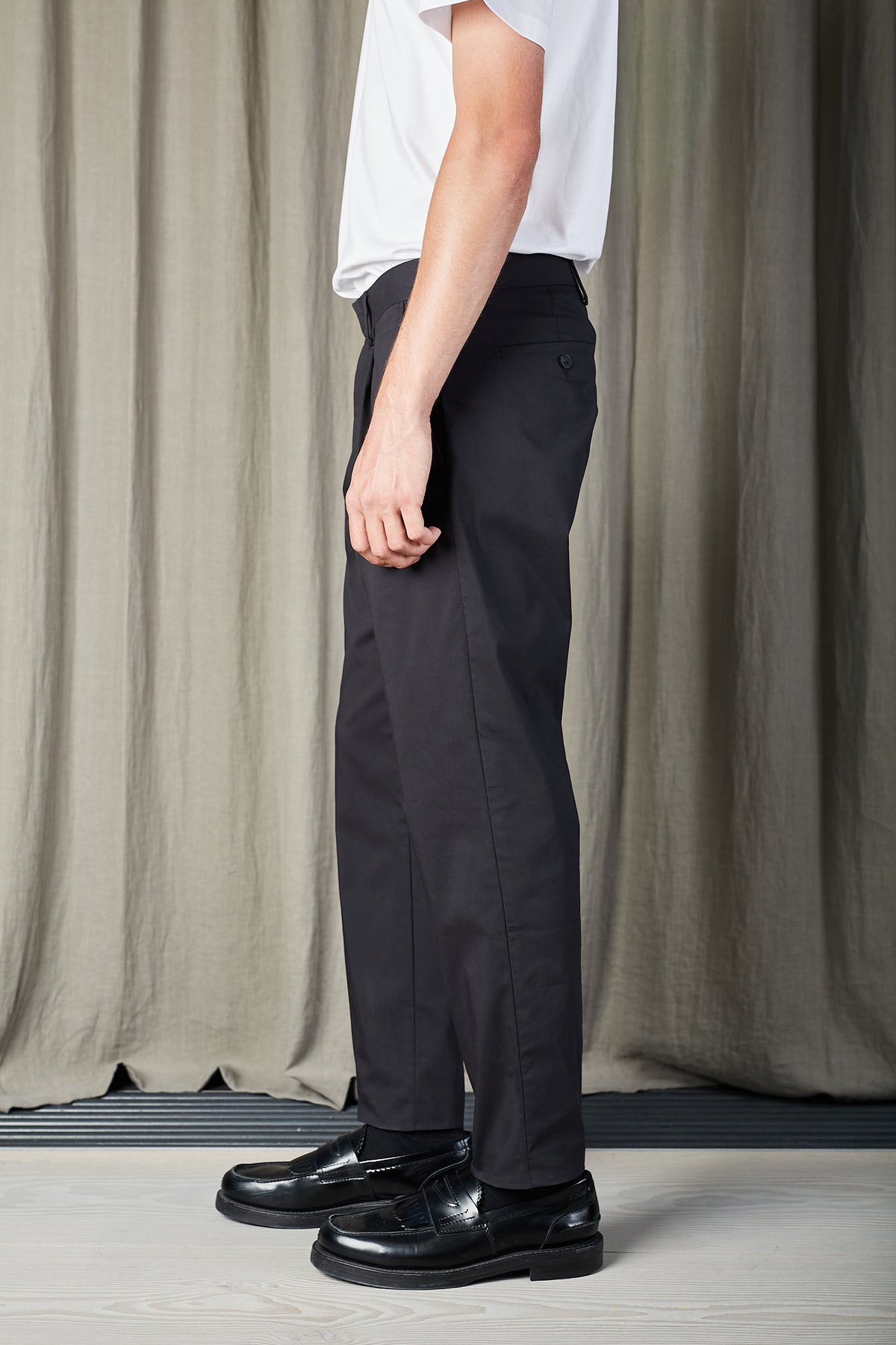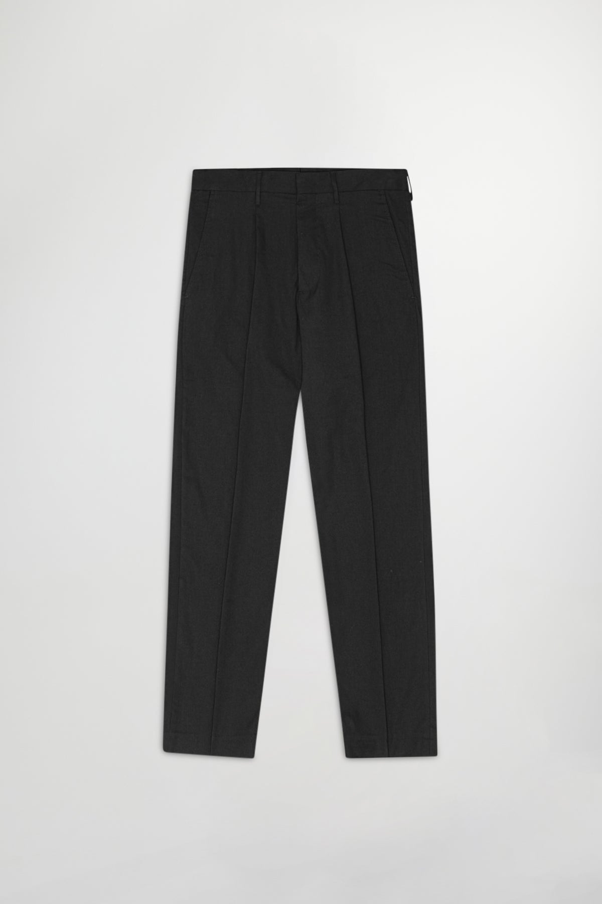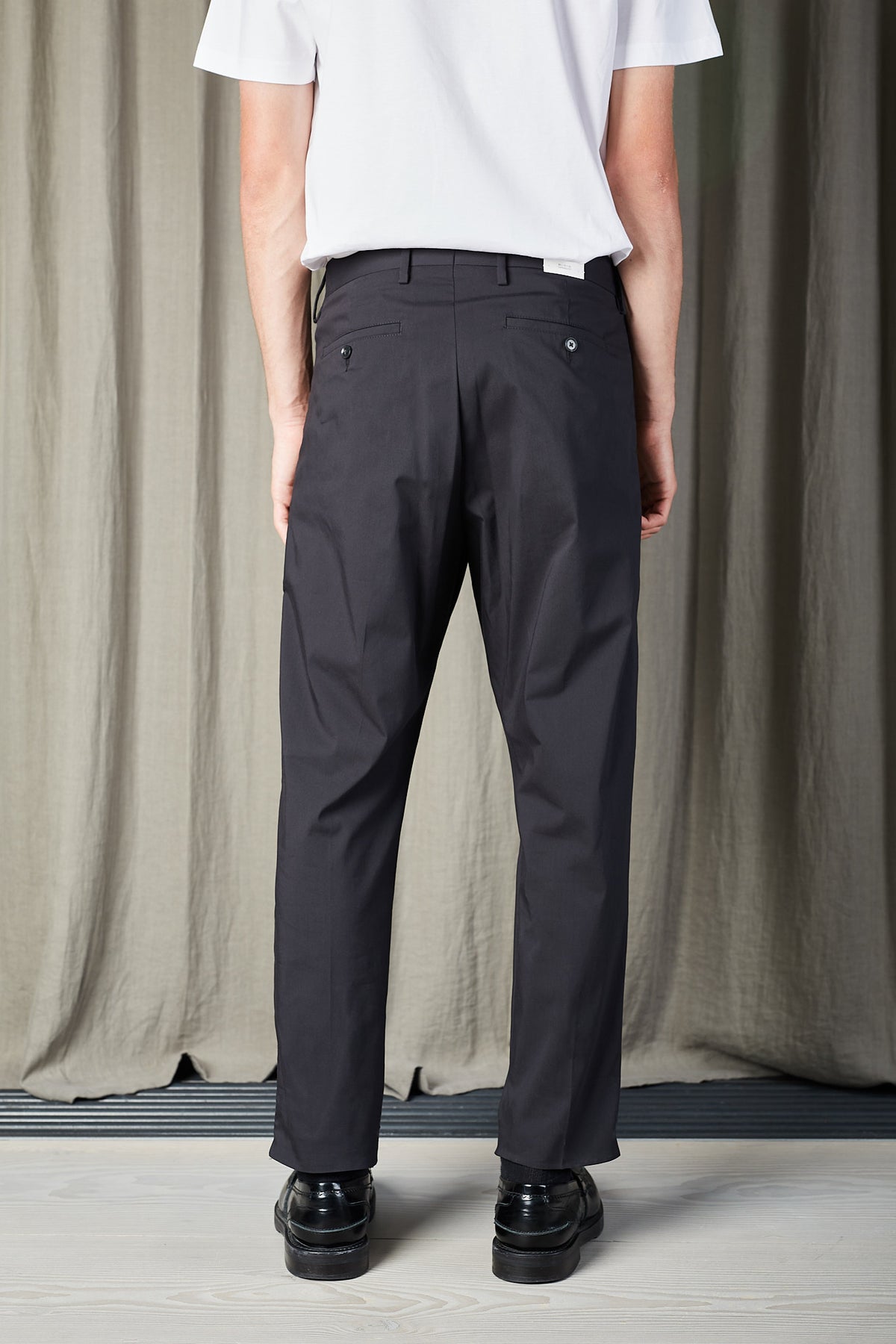 Cropped trousers in a regular fit with tapered legs, crafted in a lightweight 170 g/m2 cotton blend with a touch of stretch. Features a minimalist design with press folds, blind hem, and hidden closure.