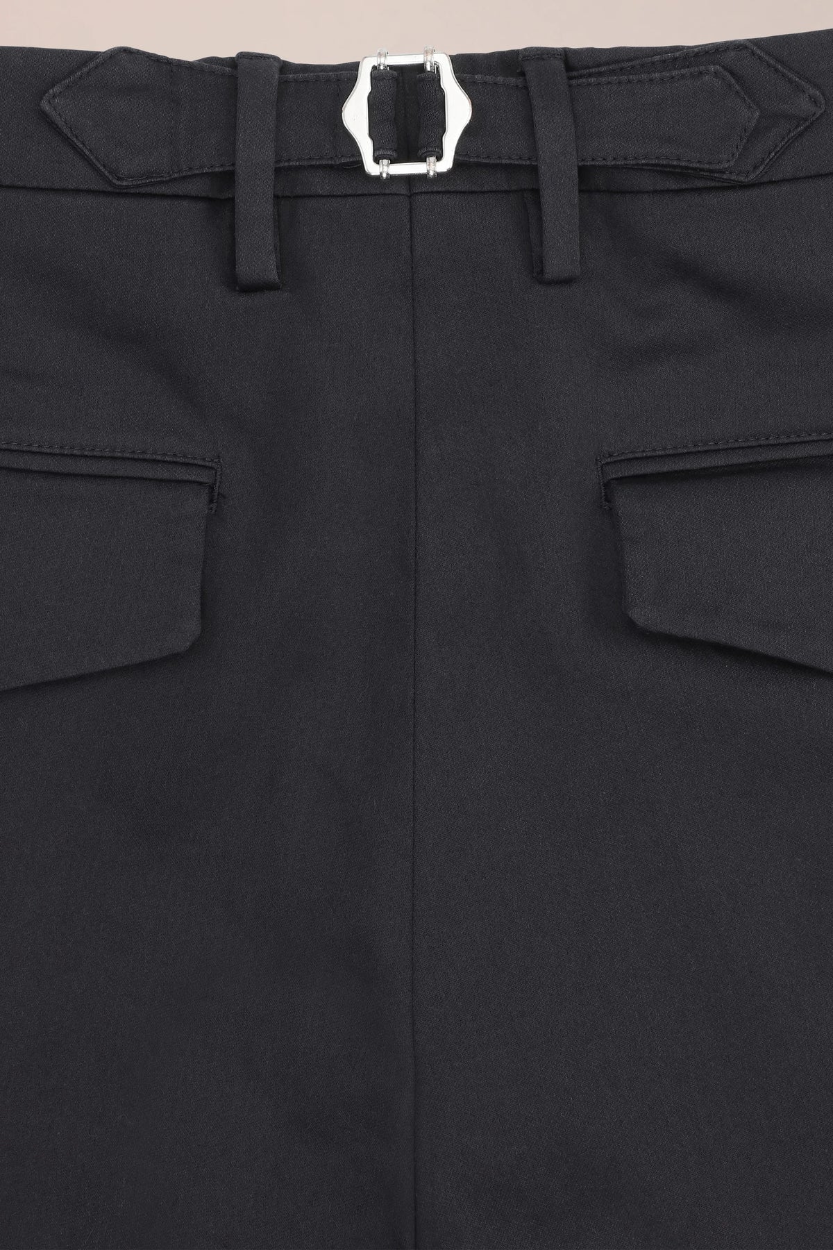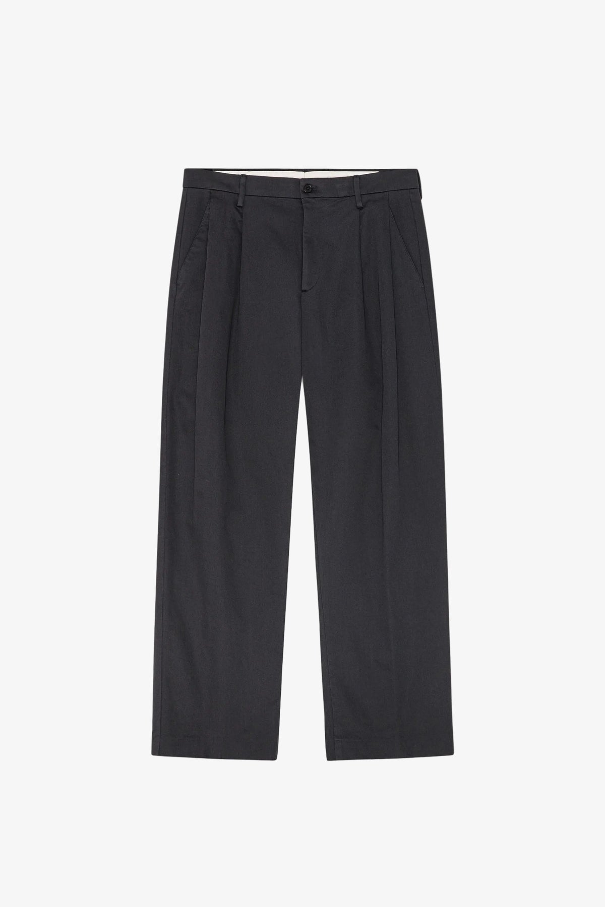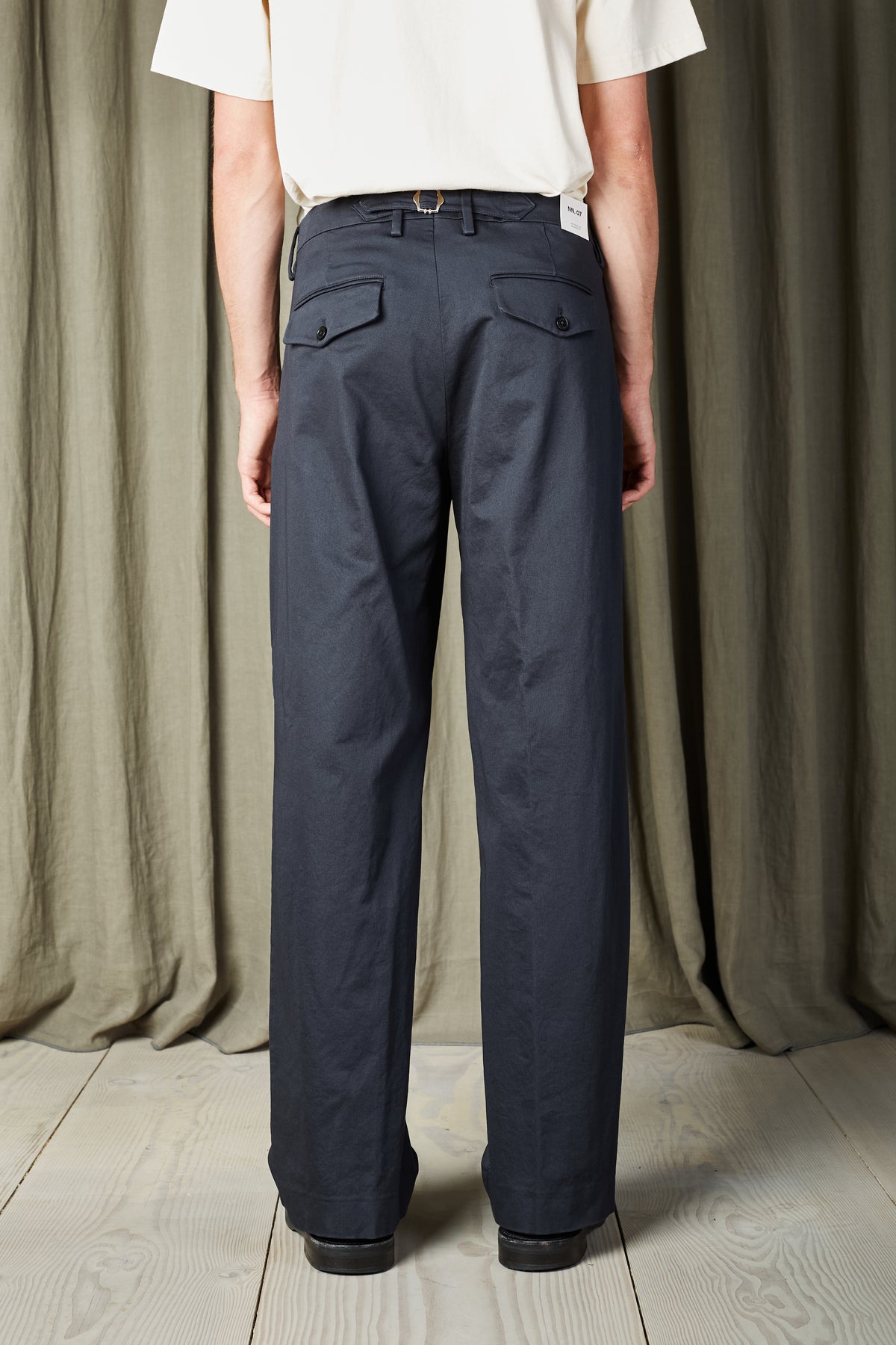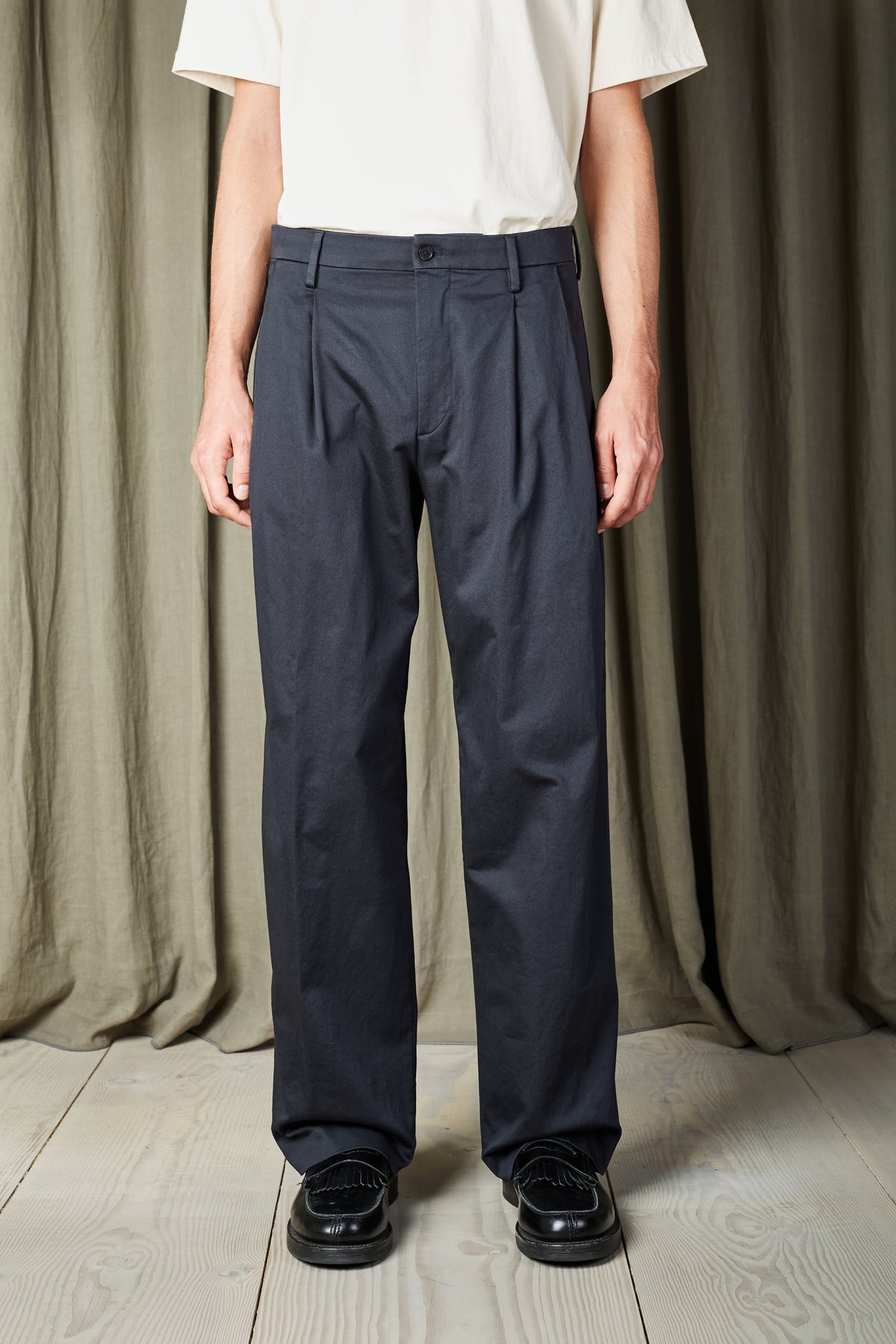Relaxed fit trousers in a wide-leg silhouette made from organic cotton with a soft brushed finish and herringbone weave. Features double pleats and waistband buckle detailing for tailored elegance.