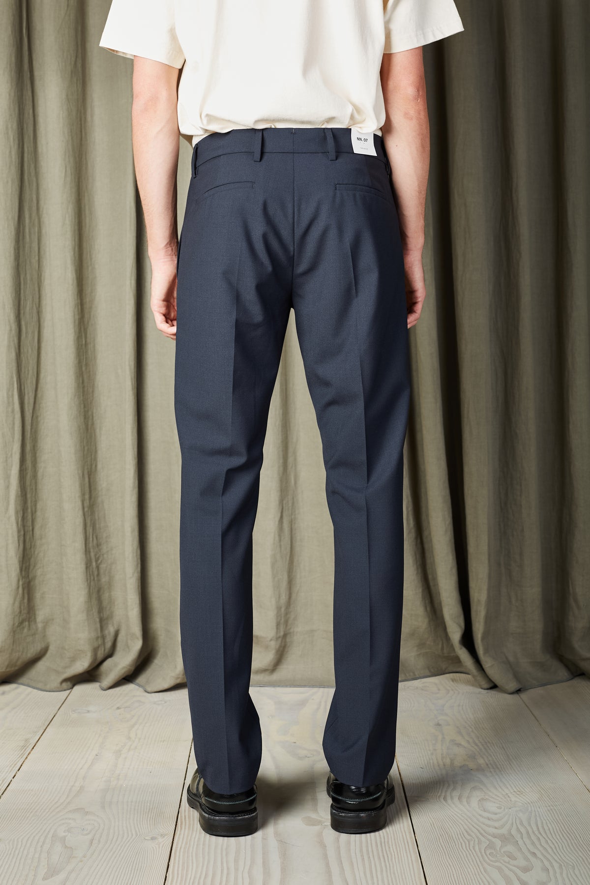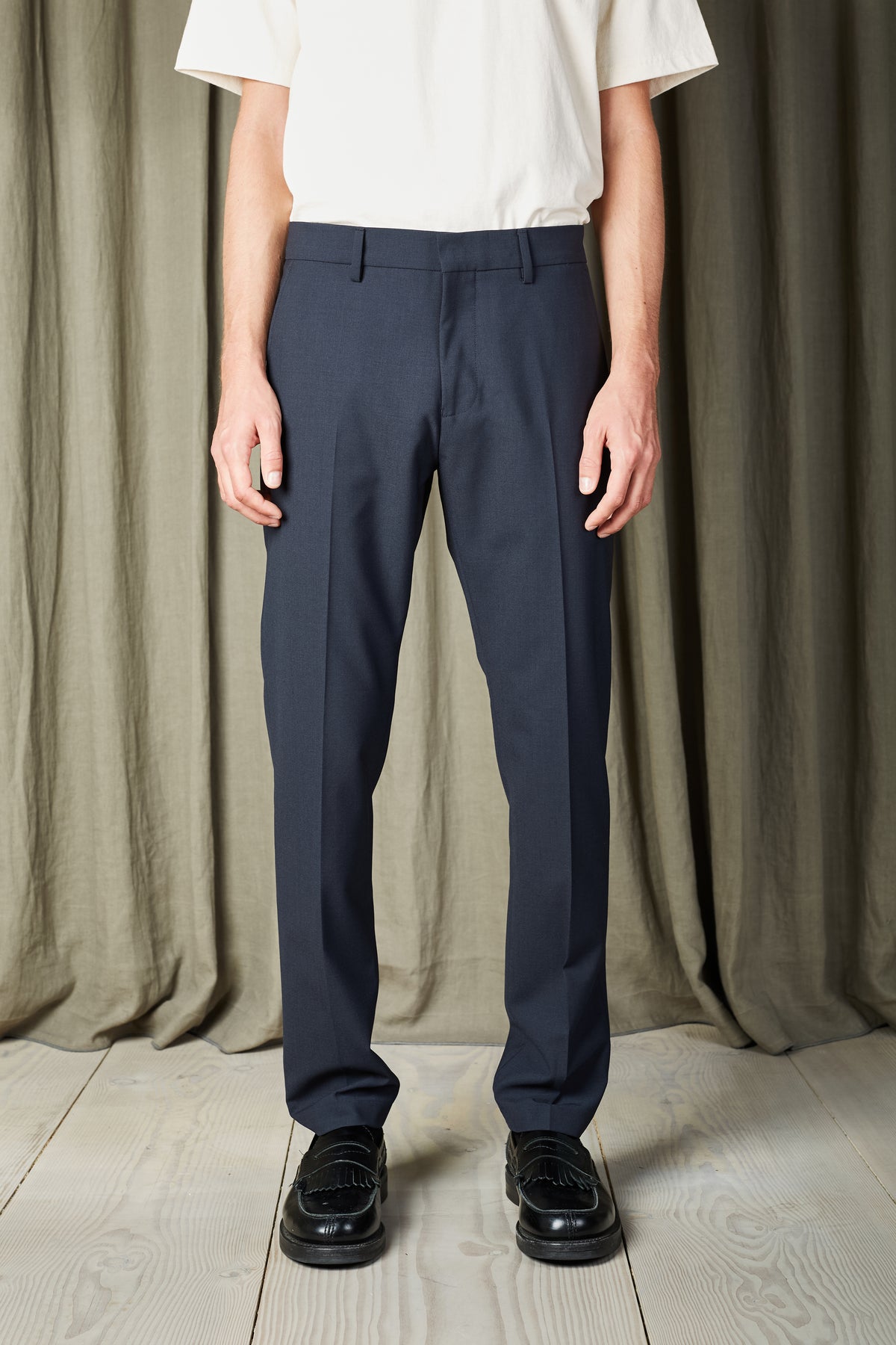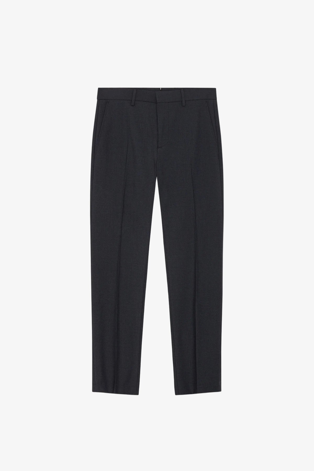 Slim-fit chinos with a slim leg, crafted from a washable wool blend with added elasticity for movement. Features a tailored waistband, hook and bar closure and a refined drapey, dressy look.