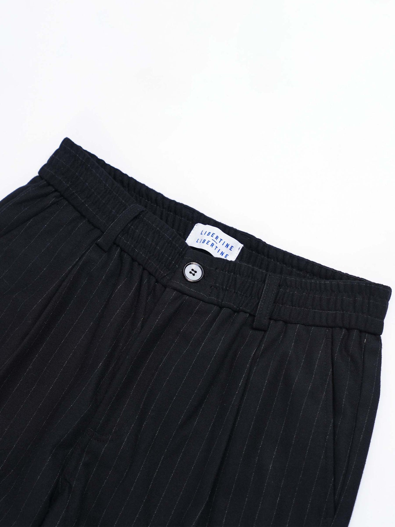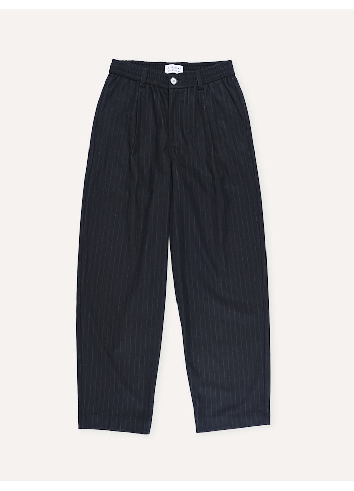 The Agency trousers are made from a subtle pin stripe wool blend. This full length, wide legged style trouser is perfect to complete a full contemporary suit in interesting silhouettes or simply a shirt or tee. Elasticated waist, center front zip fly and button closure. Welt pockets at the back and slanted pockets at the front.